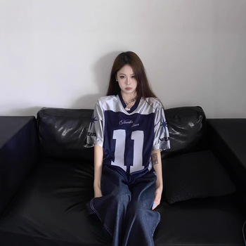 American Retro Printed Football Jersey T-Shirt Plus Size Men Women Summer Trendy Satin Stitching Loose Fit Short Sleeves